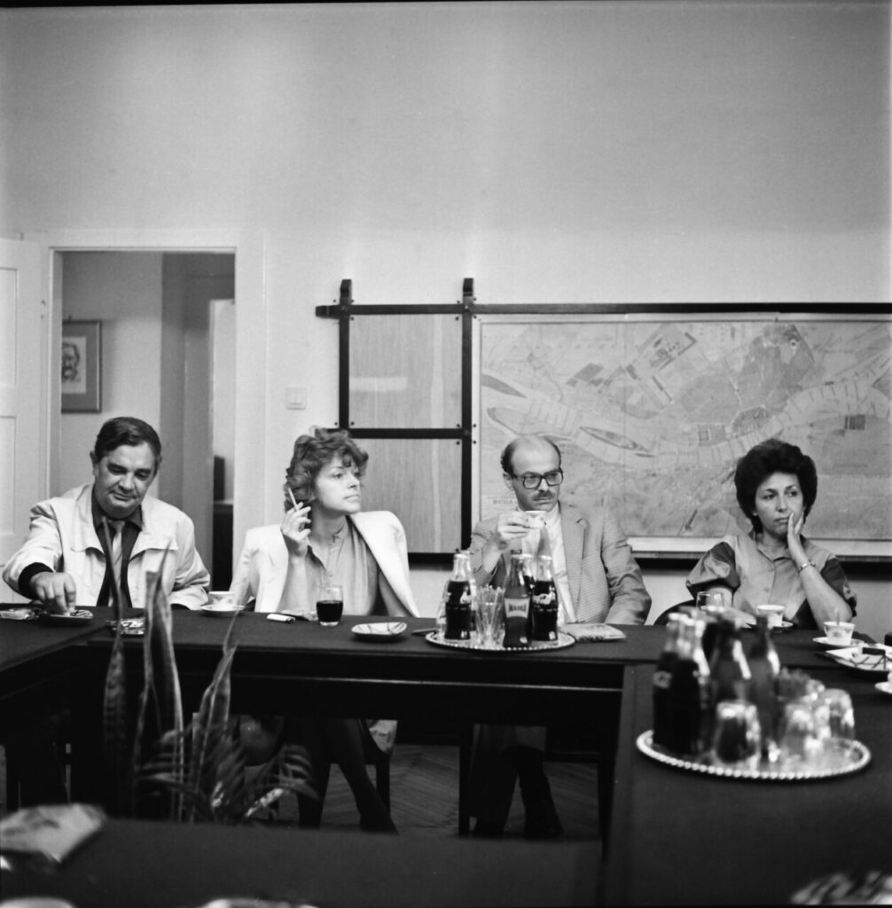 Erzsébet Radics (Head of the Cultural and Education Division of the MSZMP Central Committee) during her visit in Miskolc. Secretary of the County Party Committee László Kun, Erzsébet Radics, first secretary of the MSZMP Borsod-Abaúj-Zemplén County Committee György Fejti and Ágnes Máger in the Kós House.